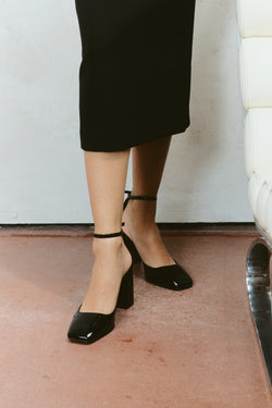 Travis is crafted from premium, patent leather with a modern square toe. This elevated style can be matched with power suits in the office or a mini pleated skirt and oversized blazer and socks for a preppy look. Finished with a cupped back and thin ankle strap with gold buckle detail. The modern yet timeless Travis will remain in style for seasons to come.