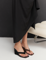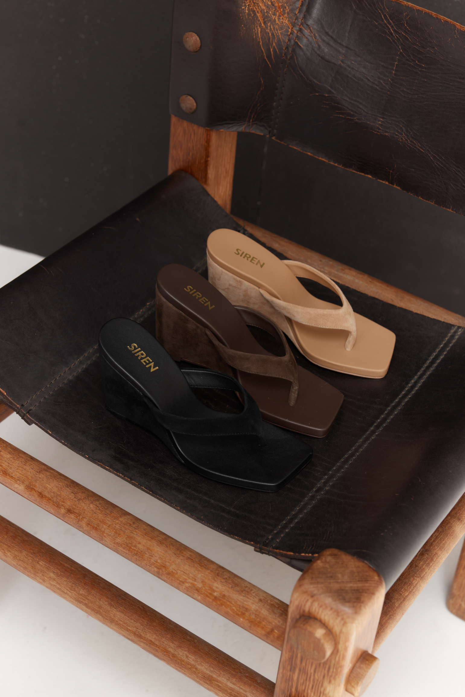 A refined rework of the classic thong, Melrose is crafted with smooth suede straps and a modern square toe. The wedge silhouette offers subtle height while maintaining all-day comfort — perfect for warm evenings and understated event dressing.